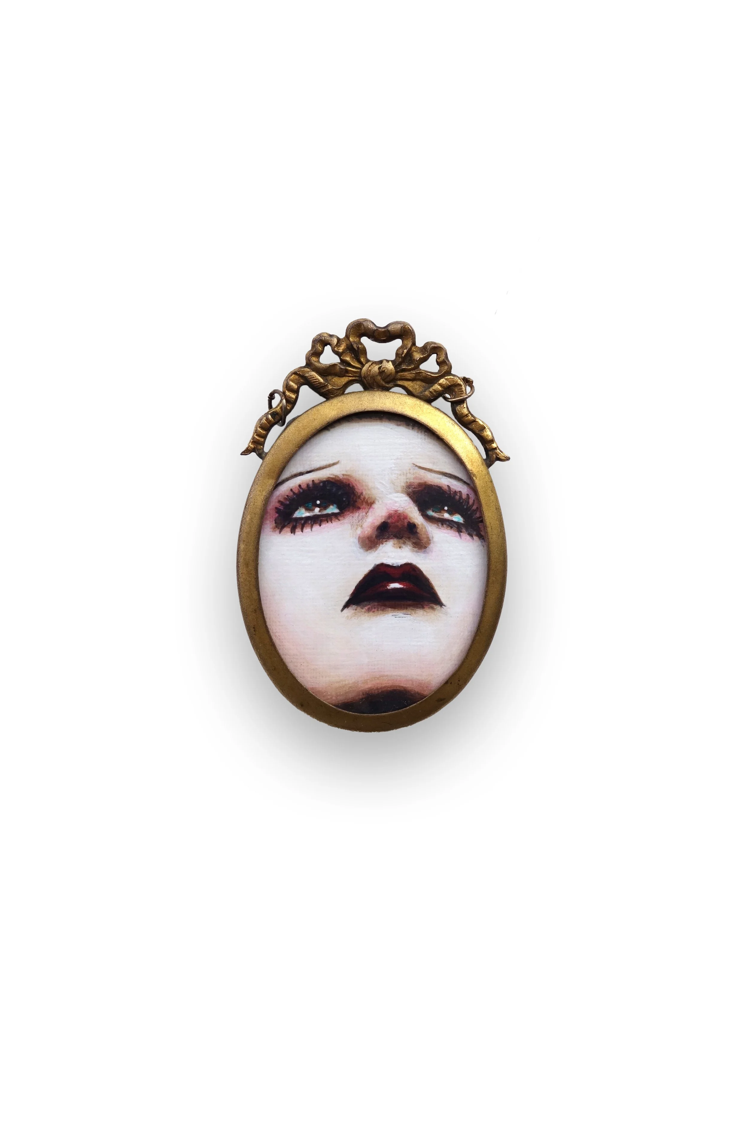 In a captivating series comprising 66 miniature paintings encased within 55 antique frames, ranging from the 16th century to the early 1930s, I intertwined my passion for portraiture with my enchantment for antiquity and art history. Over a two-year span, these frames were individually sought after across numerous international cities, each becoming a canvas for a meticulously crafted artwork, with some revealing double-sided paintings. Breathing new life into each piece while simultaneously dedicating it to the past. The collection showcases a diverse array of subjects, from spoons to spectacles, pendants to lockets, and frames to brooches. Some pieces still retain original locks of hair, inscriptions, and symbolic tokens of affection from their respective eras. The paintings within the frames are executed on primed canvas, in blends of acrylic paint, glazes, metal leaf, and some in oil paint.