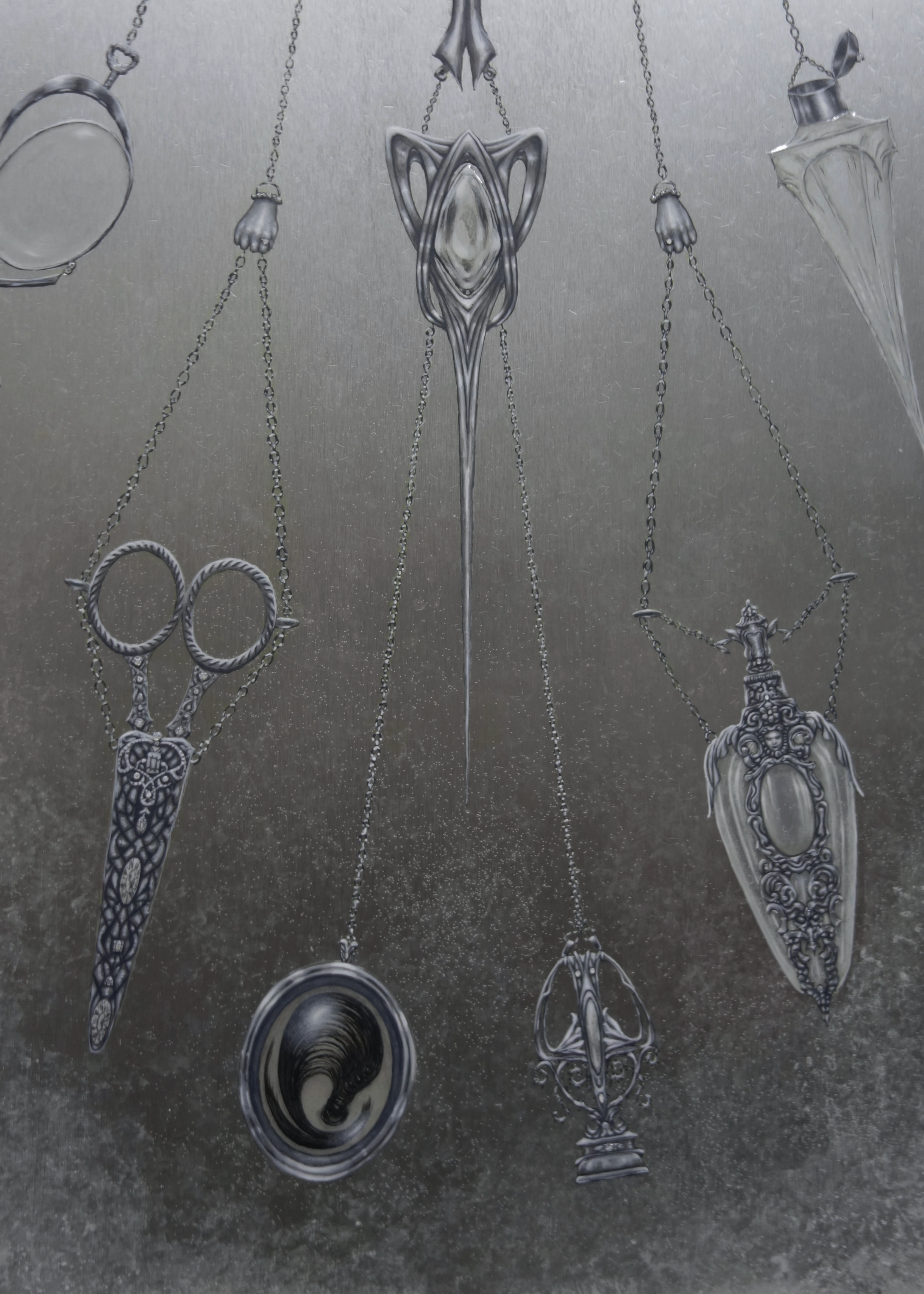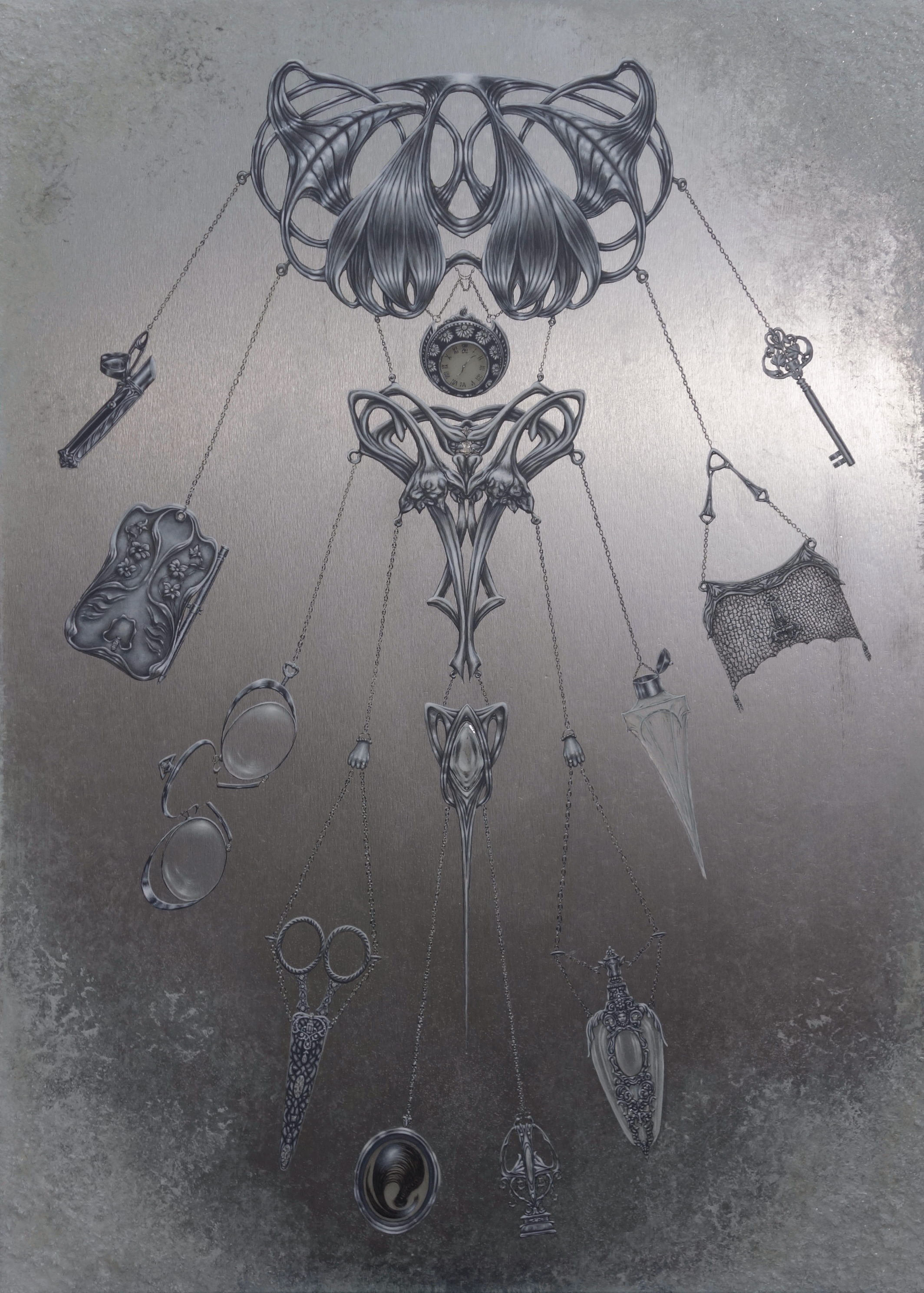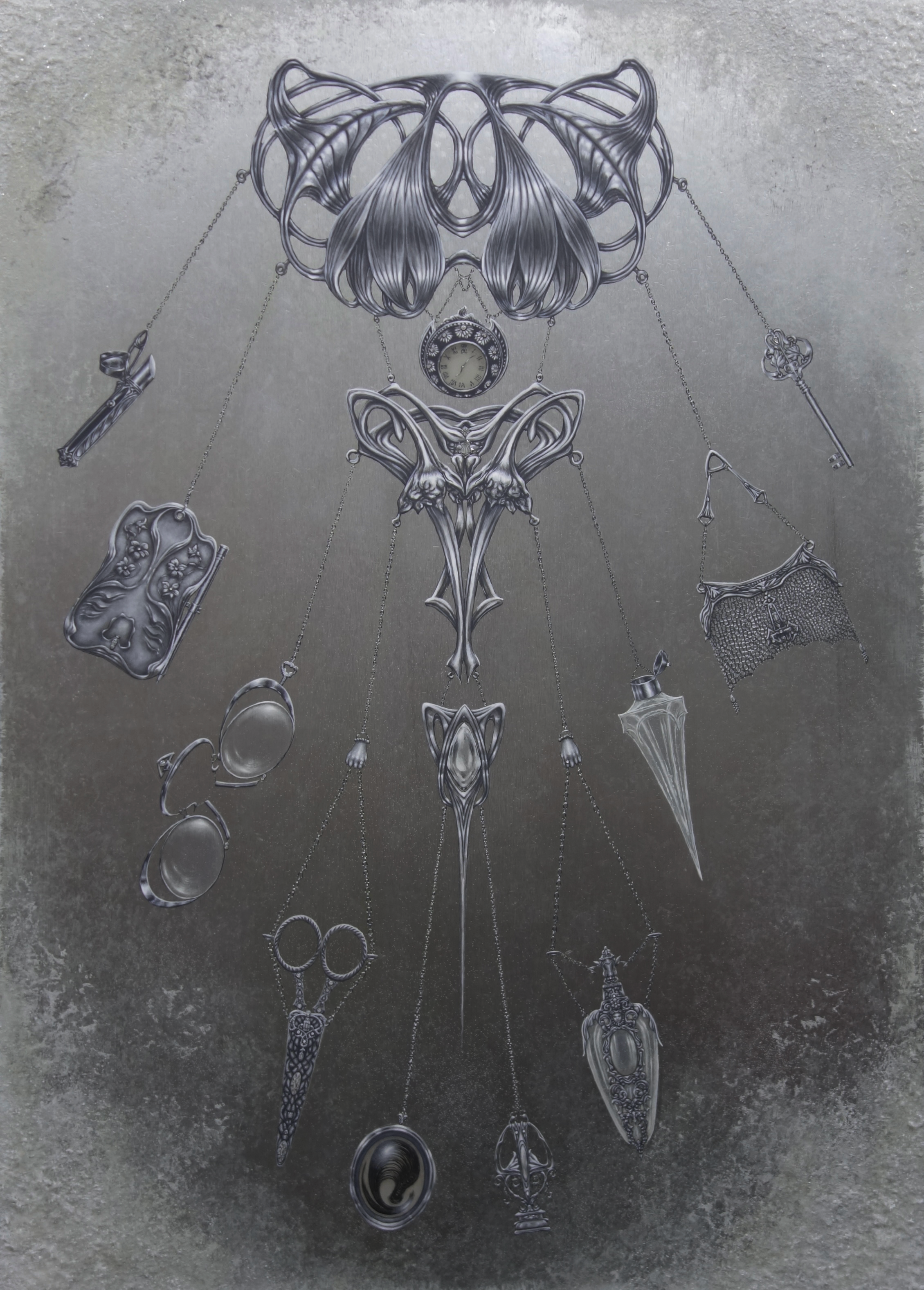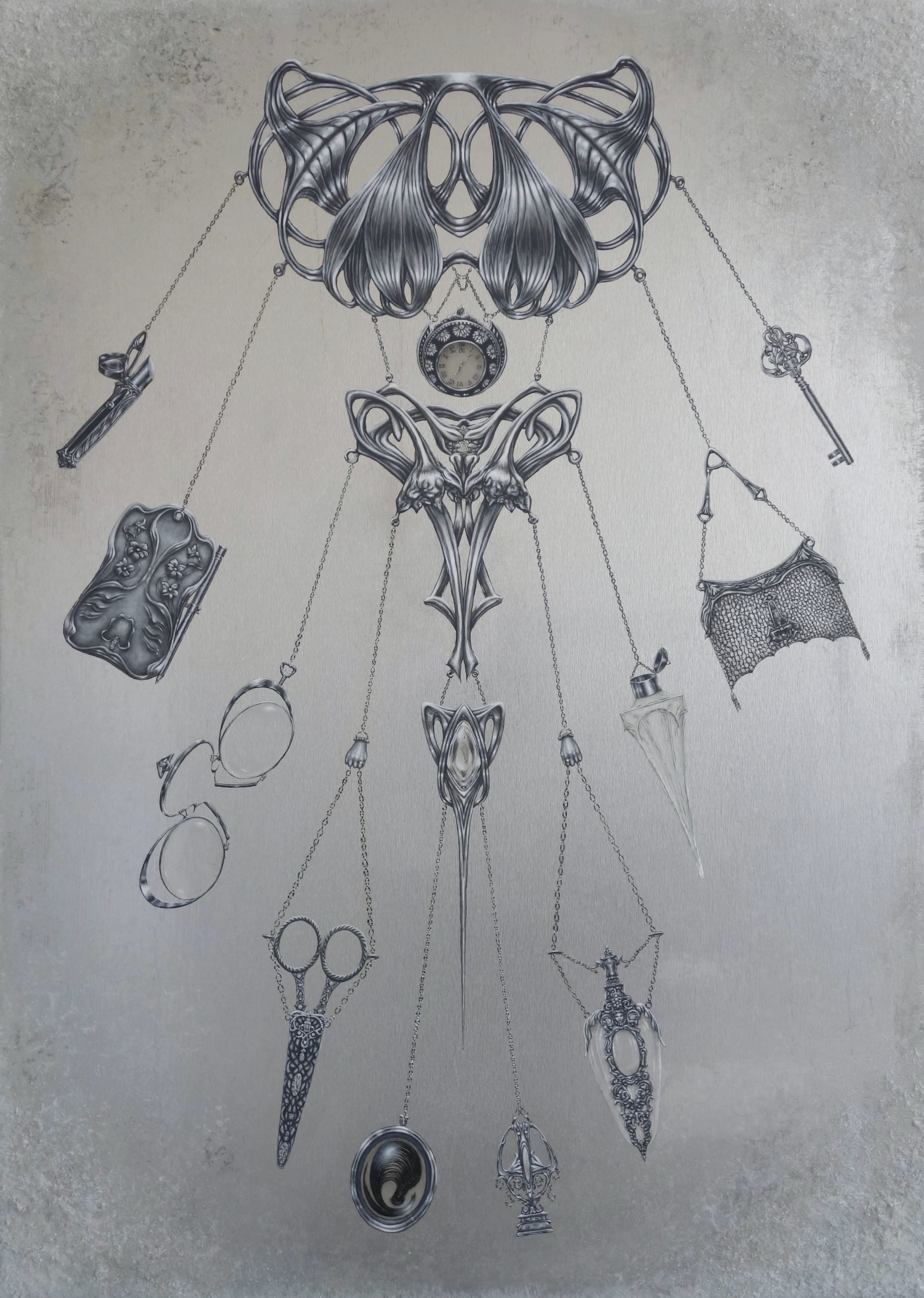 Set within the Art Nouveau period (1890sβ1910s), the work centers on a silver chatelaine carrying the remnants of a life once lived. Historically worn at the waist, chatelaines held the tools of a womanβs daily life and evolved into visible expressions of identity, status, and role. They functioned as both utility and personal portrait, worn visibly in society.
